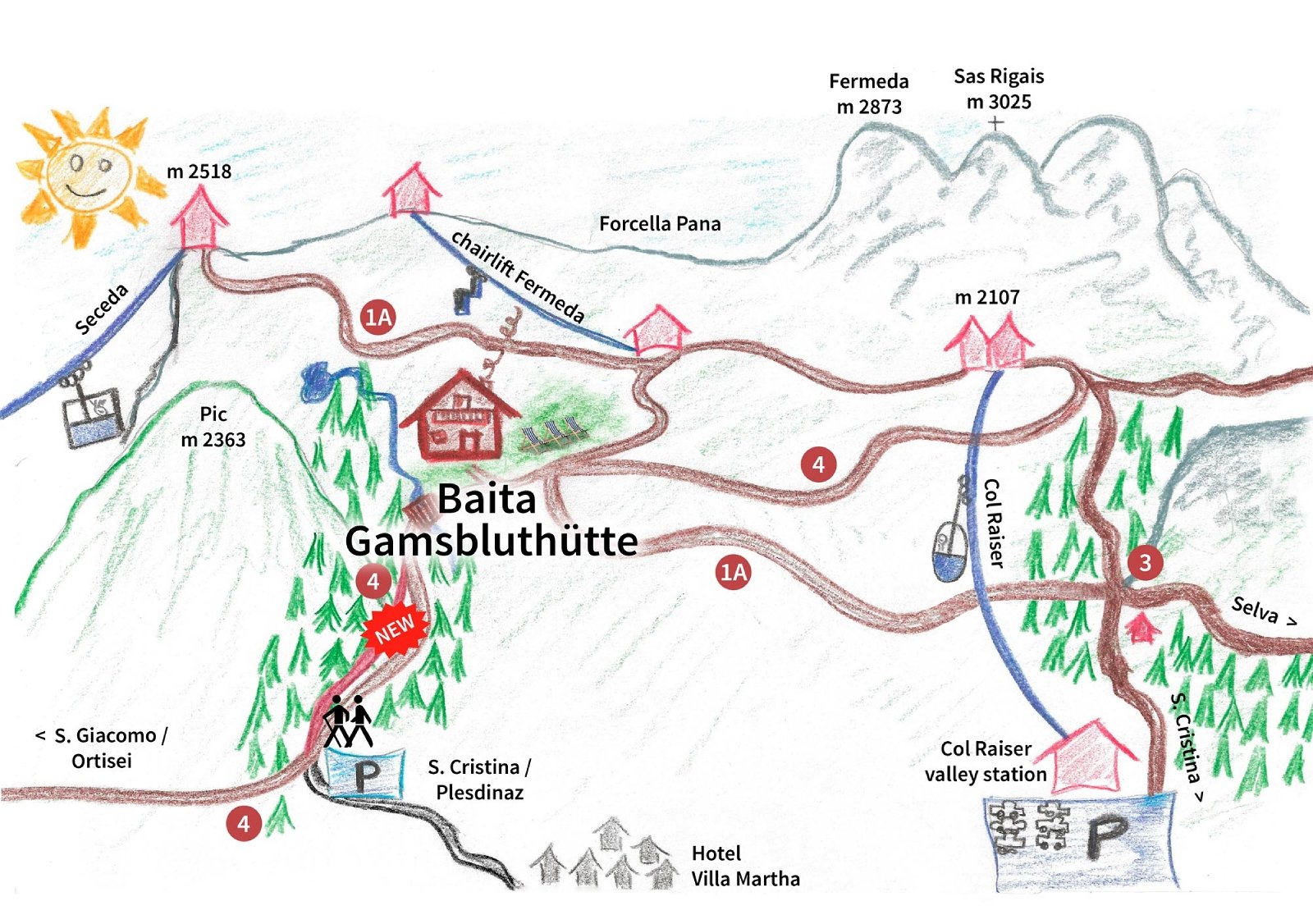 In the heart of the Dolomites with the Sassolungo and the Sella Group situated right across the valley and at the threshold of the Nature Park Puez-Odle with its many beautiful walks. Our mountain hut, overlooking Val Gardena, is therefore the ideal stop for a snack or a tasty traditional dish accompanied by a house schnapps.